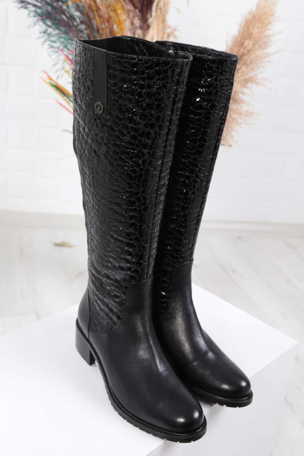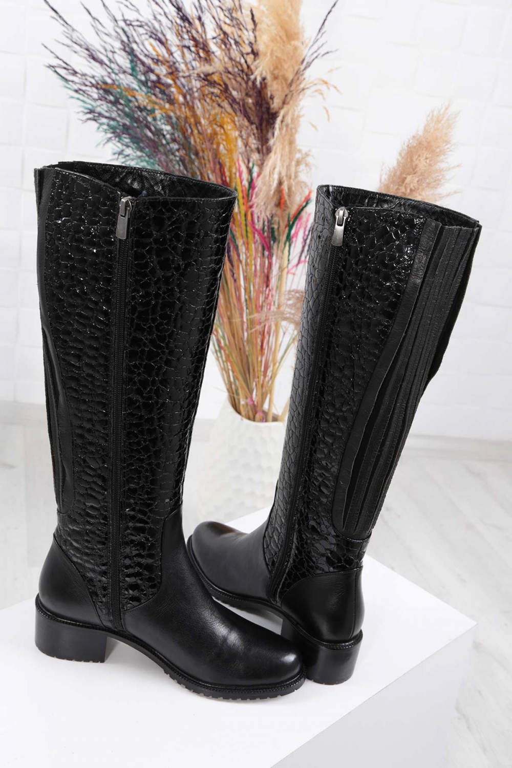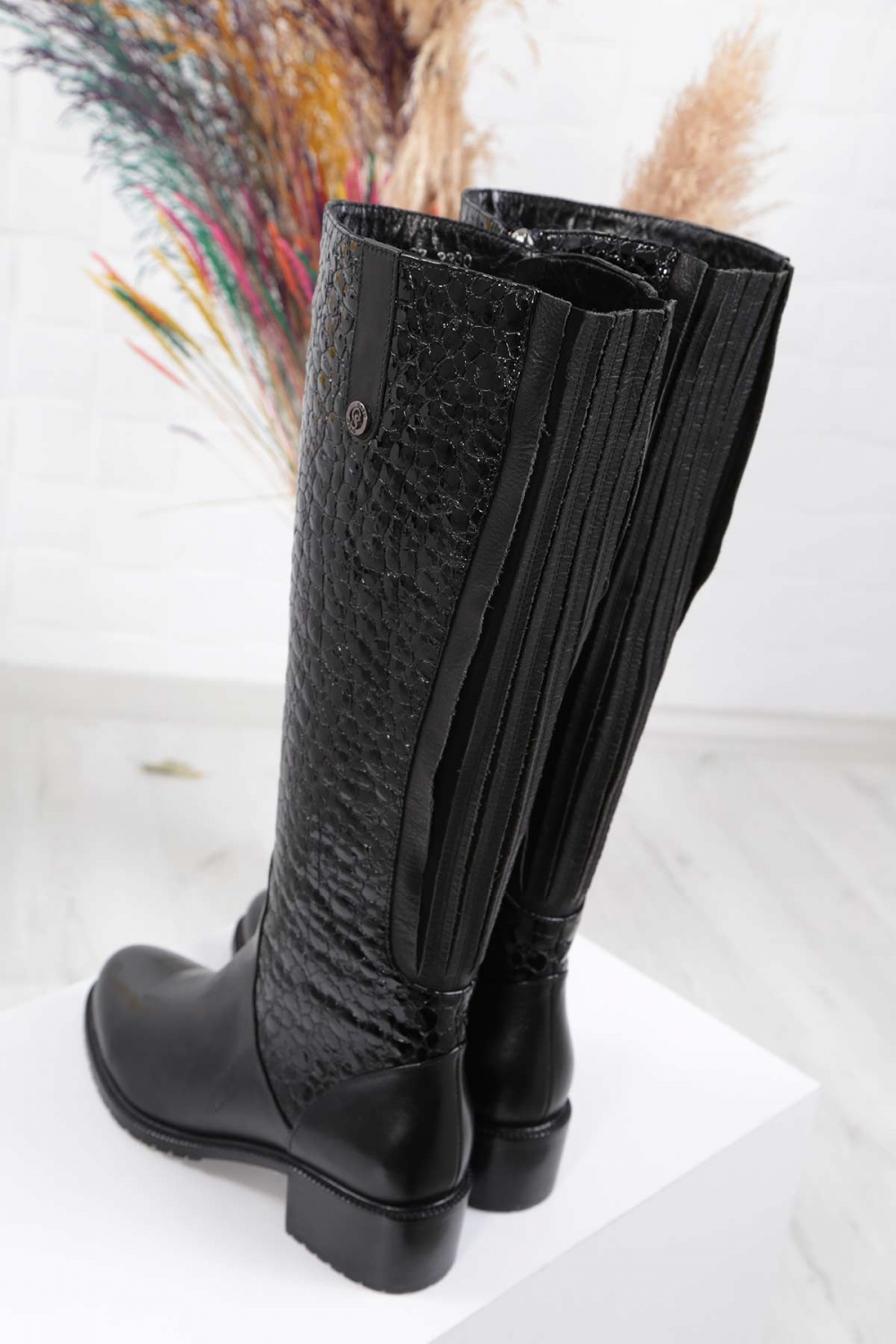 Hakiki Deri Siyah Kırık Rugan Kadın Topuklu Çizme 242127300