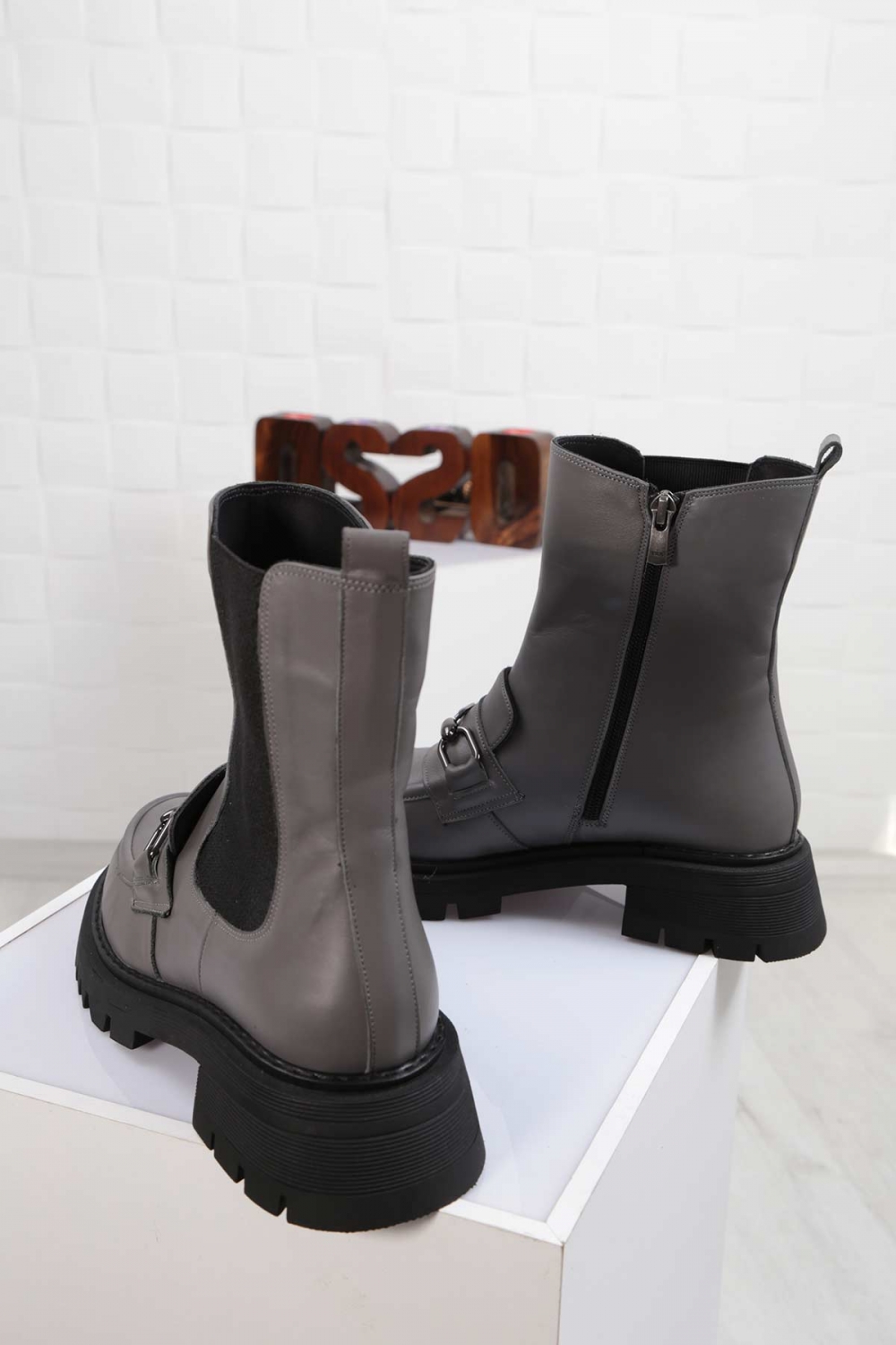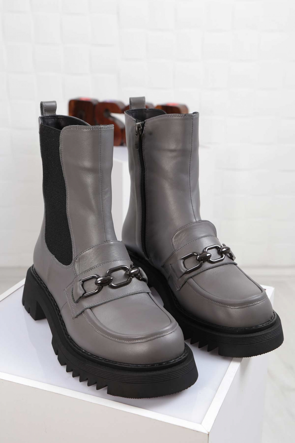 Hakiki Deri Gri Kadın Düz Bot 212127223