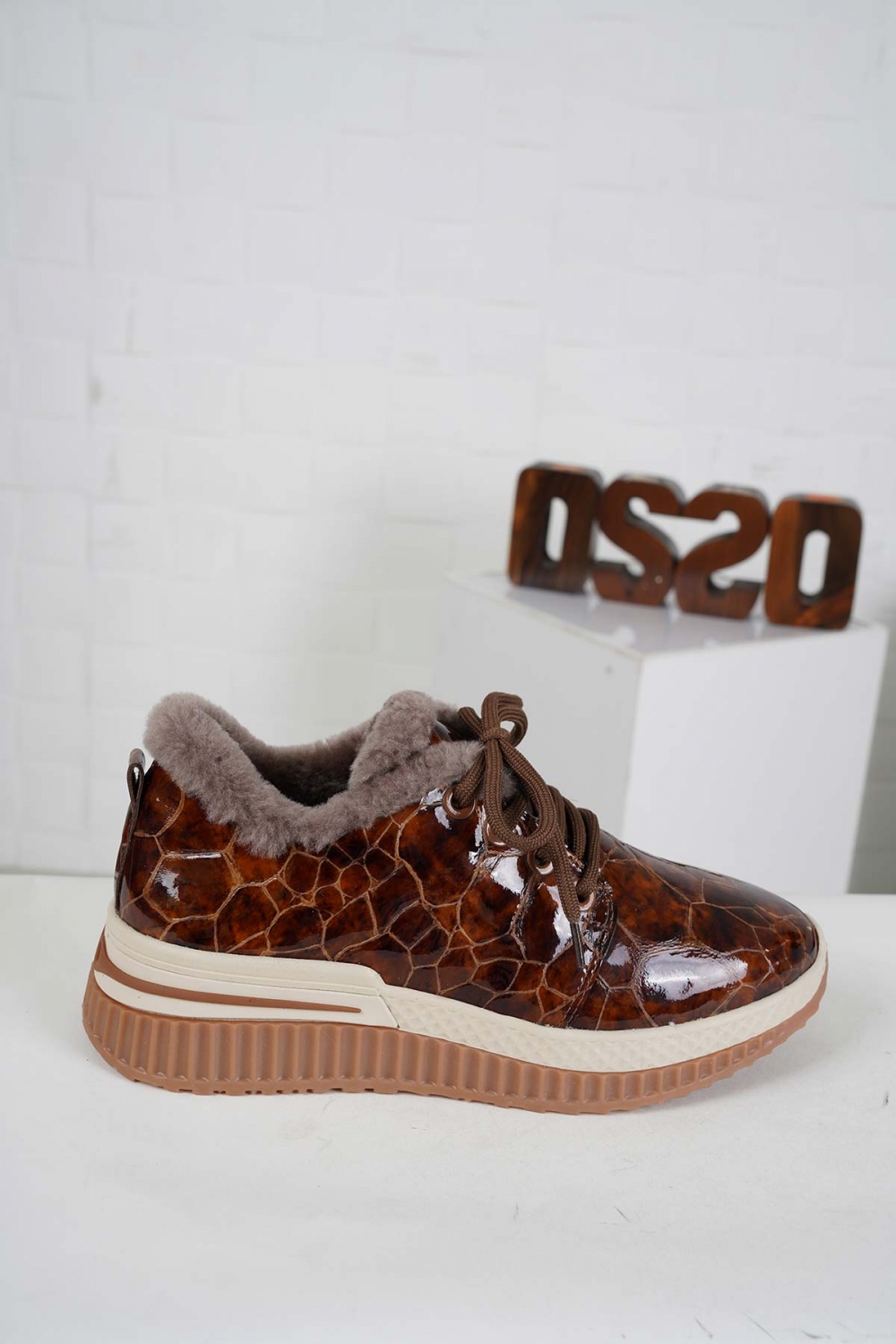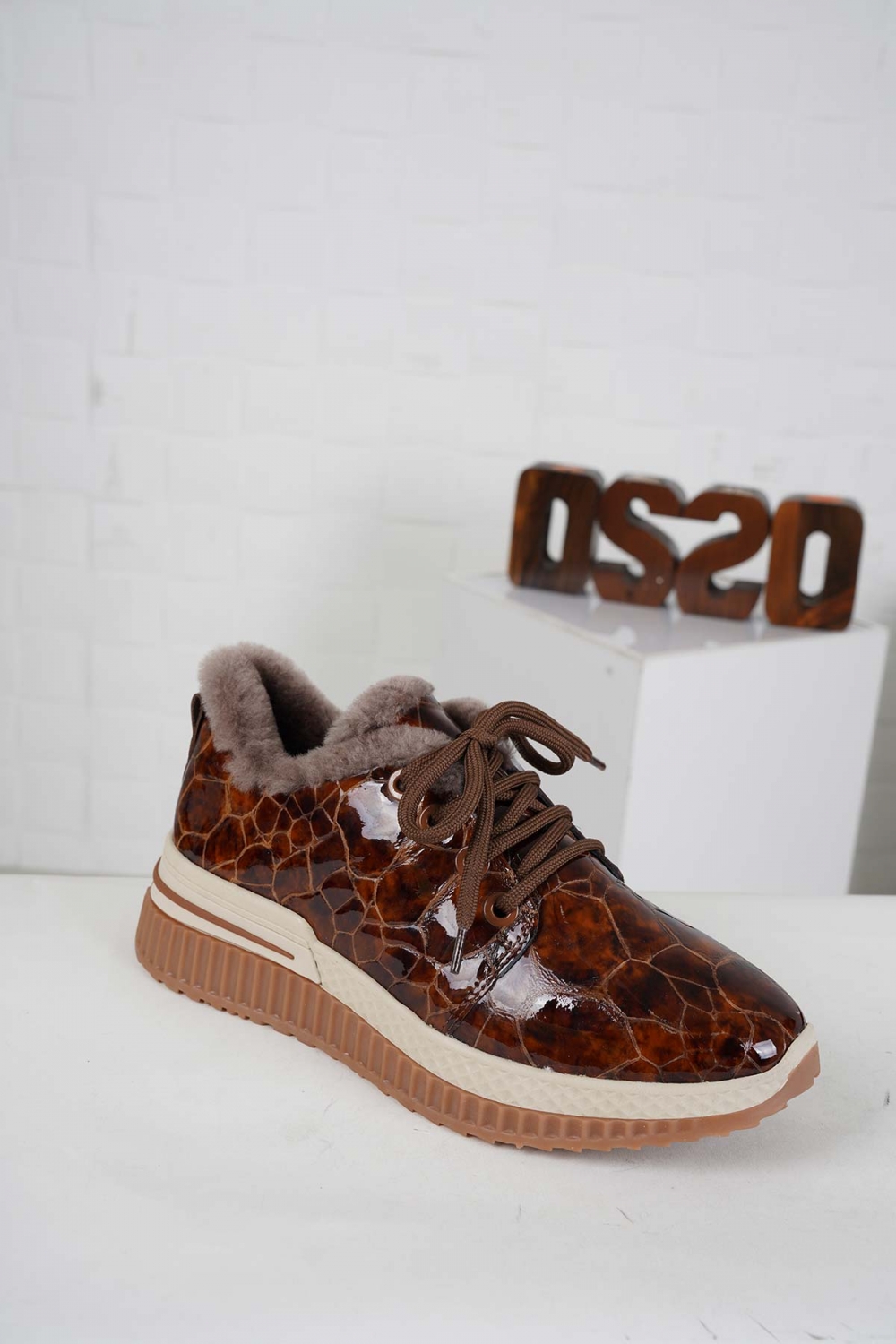 Hakiki Deri Kürklü Taba Mermer Rugan Kadın Casual Ayakkabı 242225102