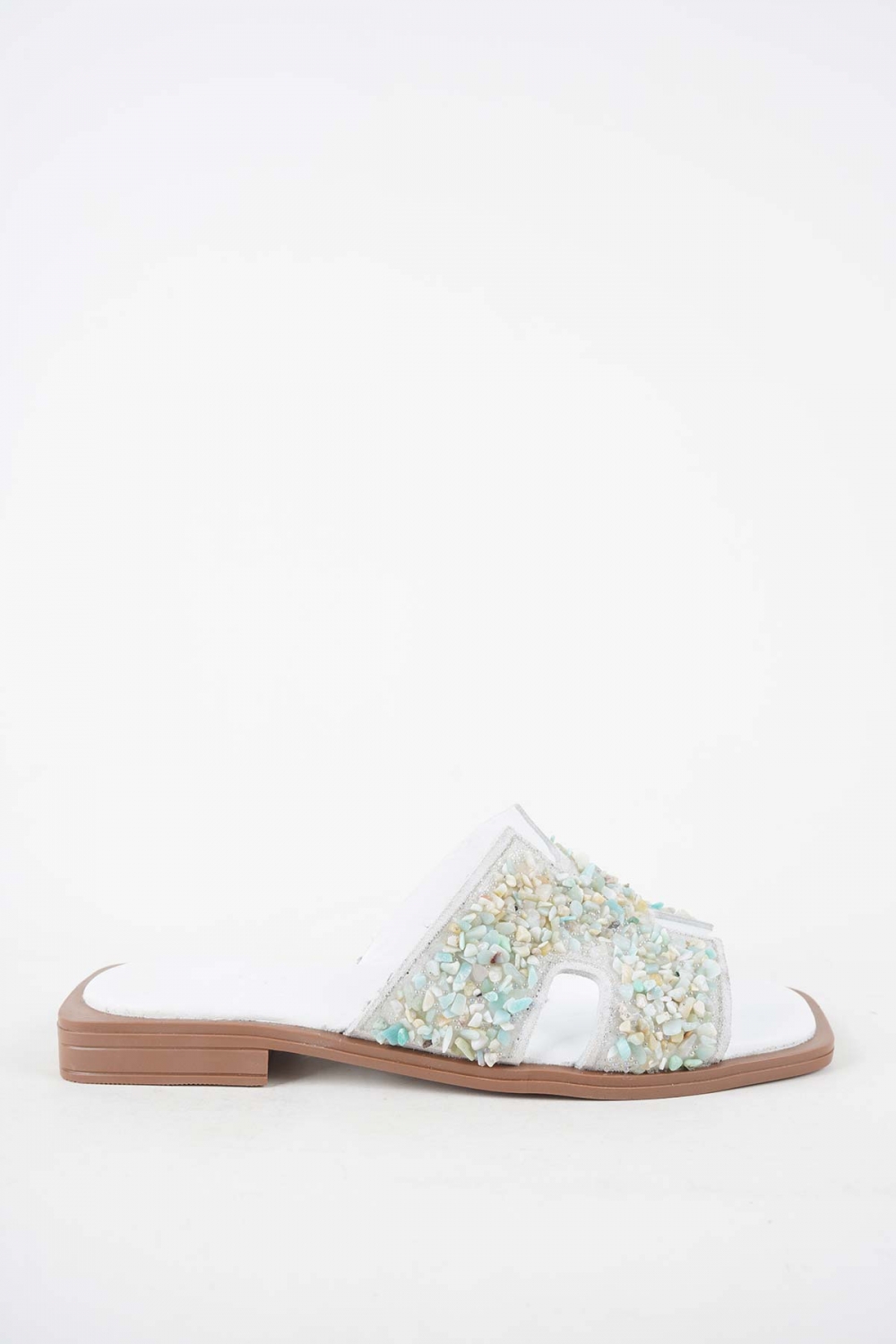 Hakiki Deri Beyaz Taş Kadın Düz Terlik 251103608