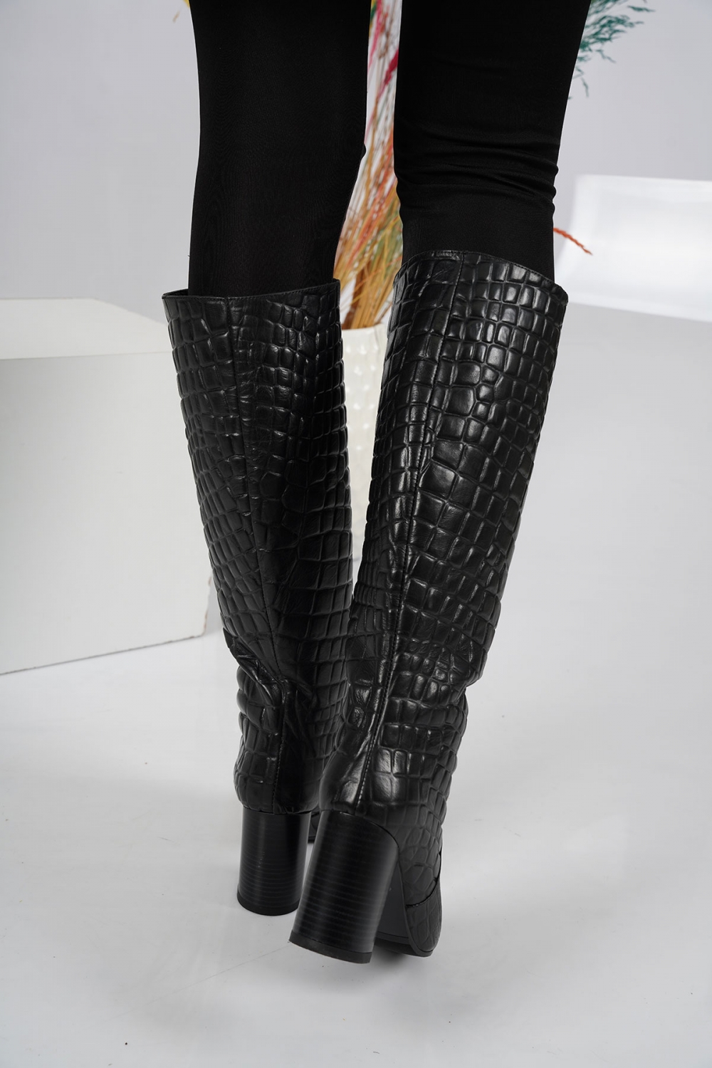 Hakiki Deri Siyah Kroko Kadın Yüksek Topuklu Çizme 202110317
