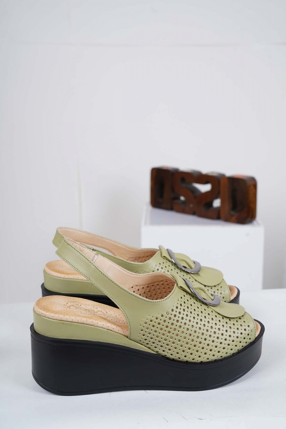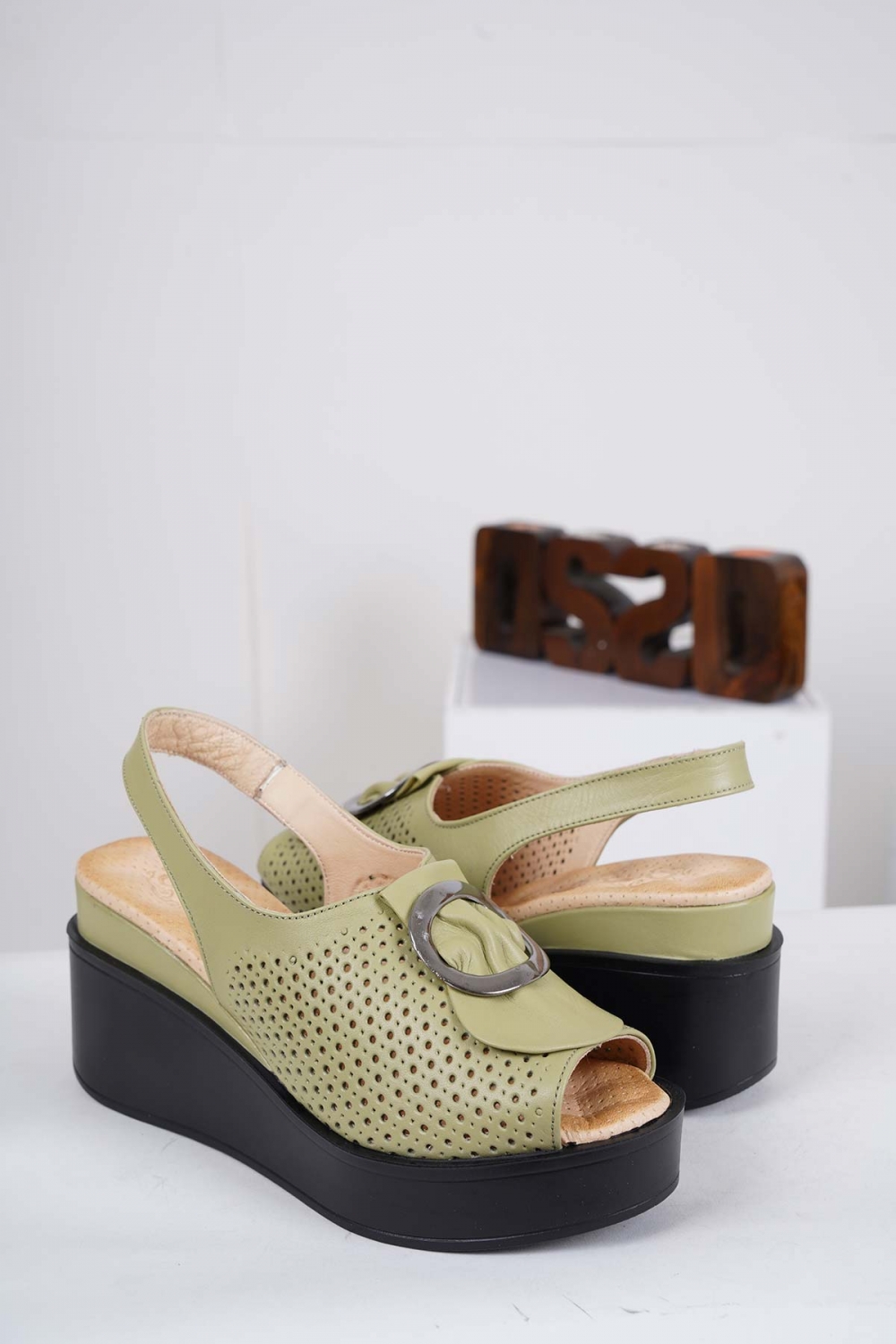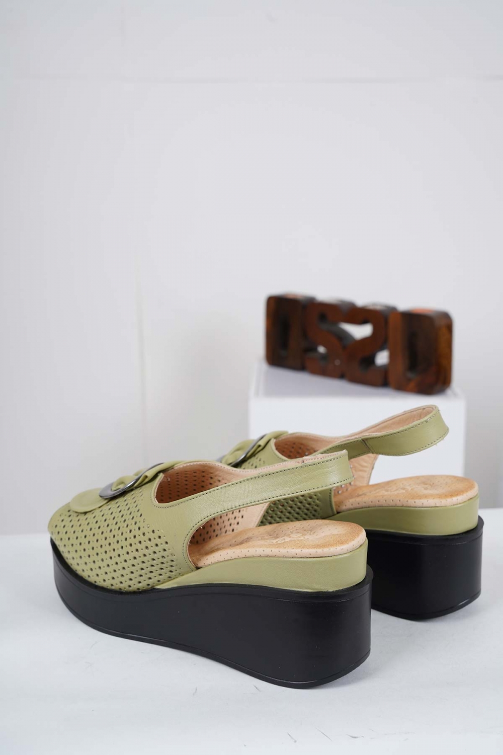 Hakiki Deri Avokado Yeşil Kadın Dolgu Topuk Sandalet 231229503