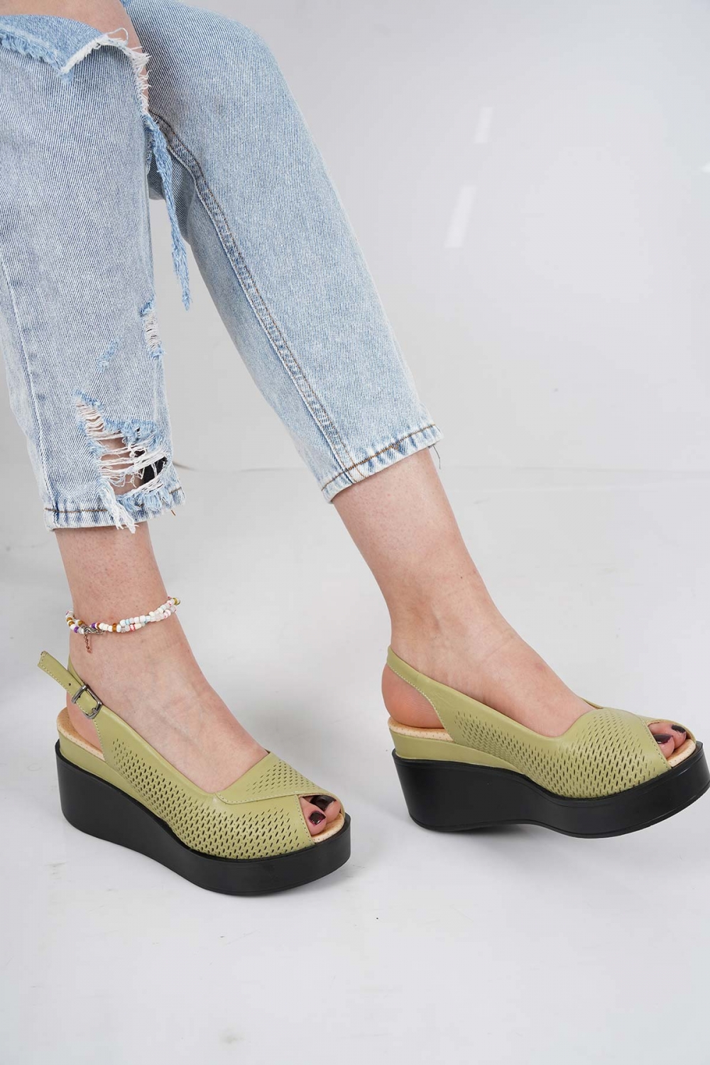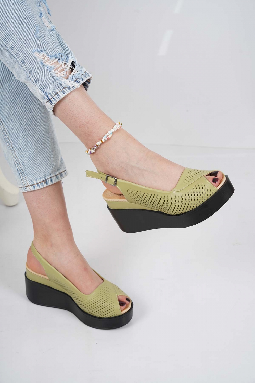 Hakiki Deri Avokado Yeşil Kadın Dolgu Topuk Sandalet 231229510