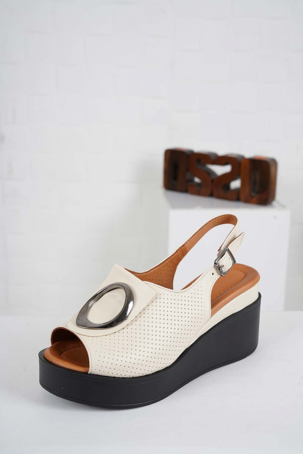 Hakiki Deri Bej Kadın Dolgu Topuk Sandalet 241229503