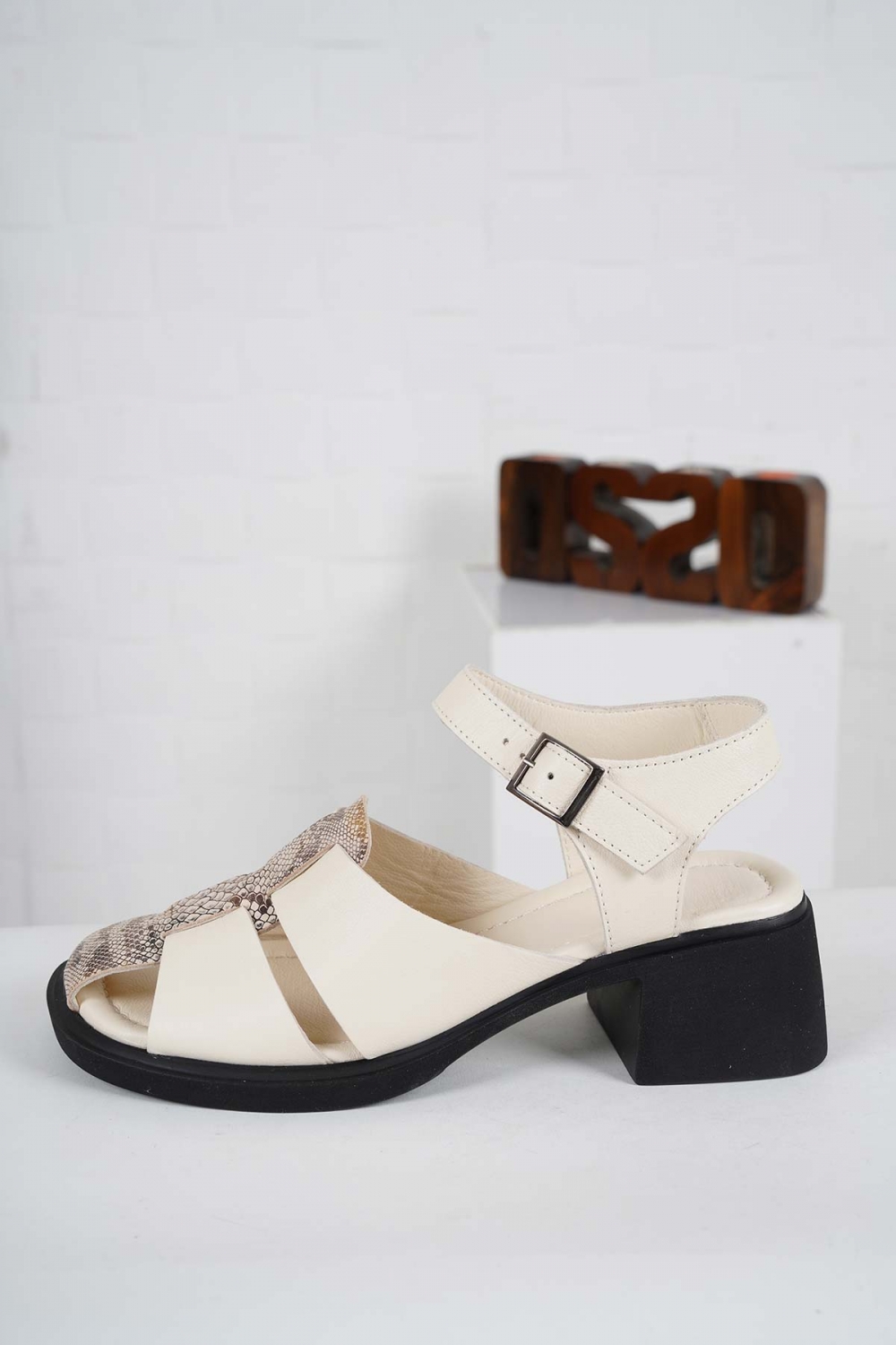 Hakiki Deri Bej-Yılan Baskı Kadın Topuklu Sandalet 241225501