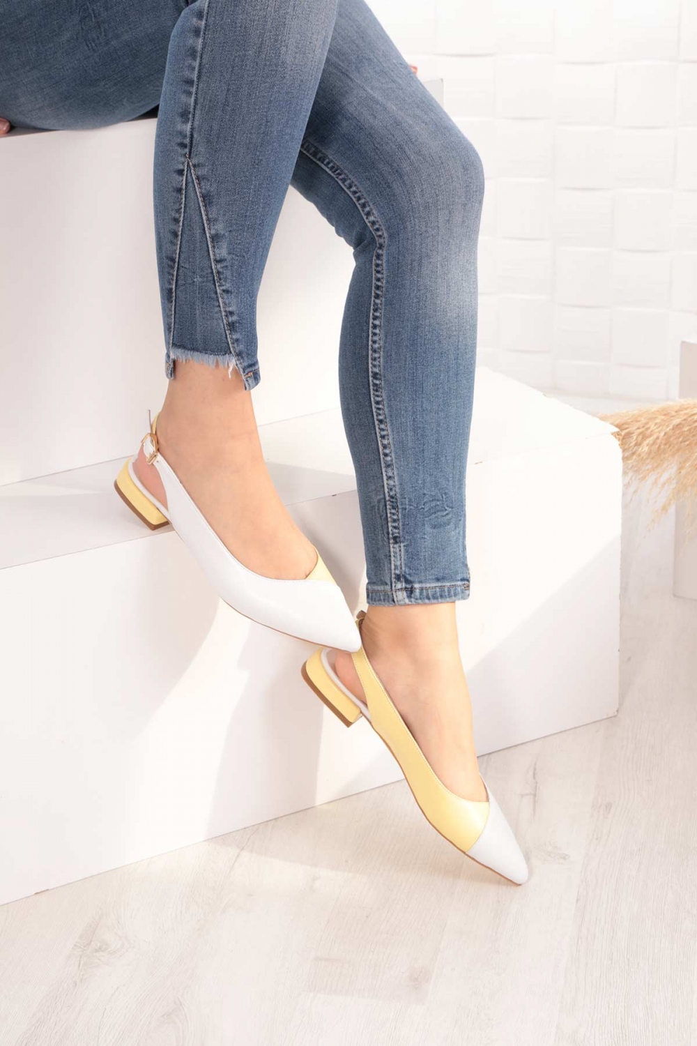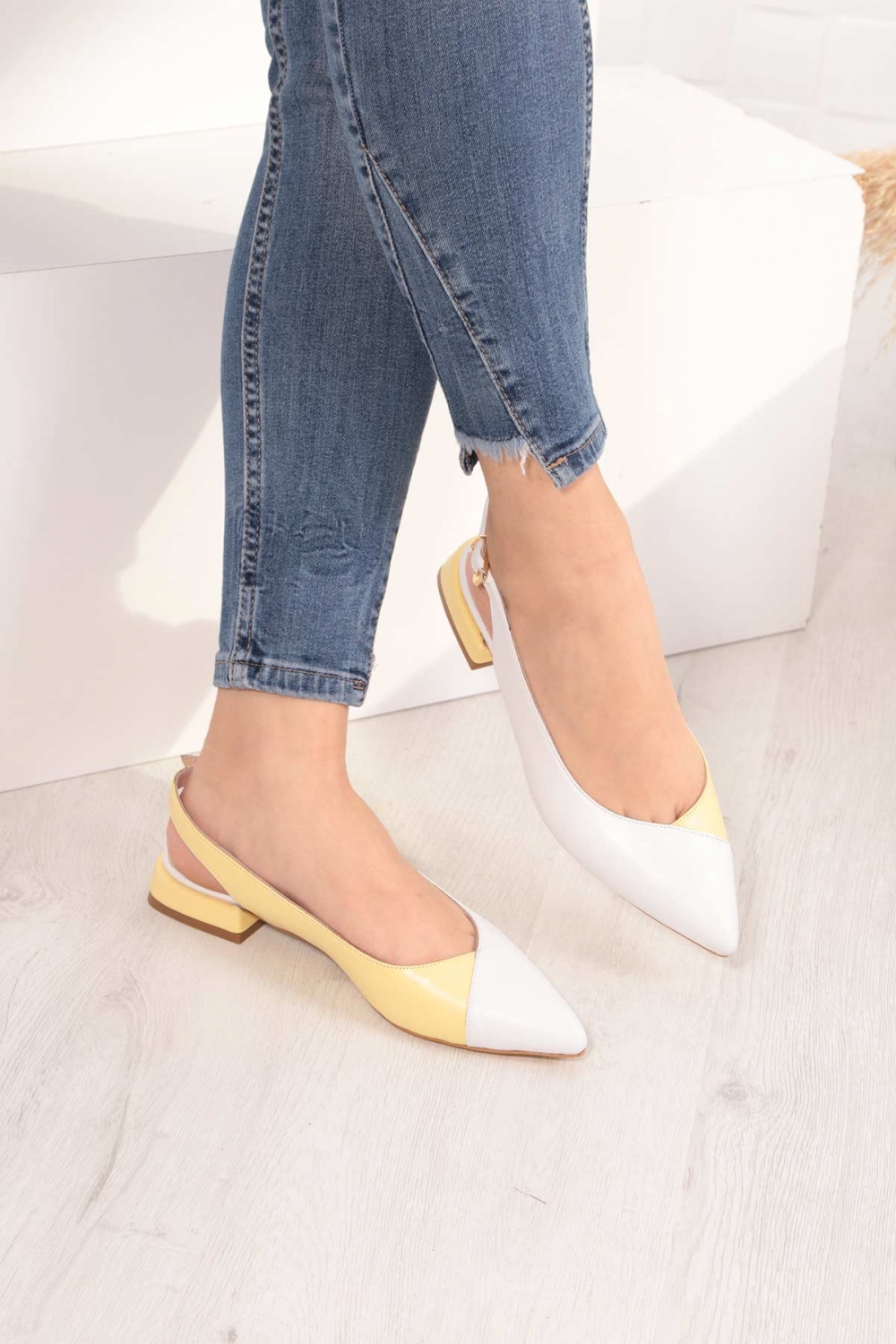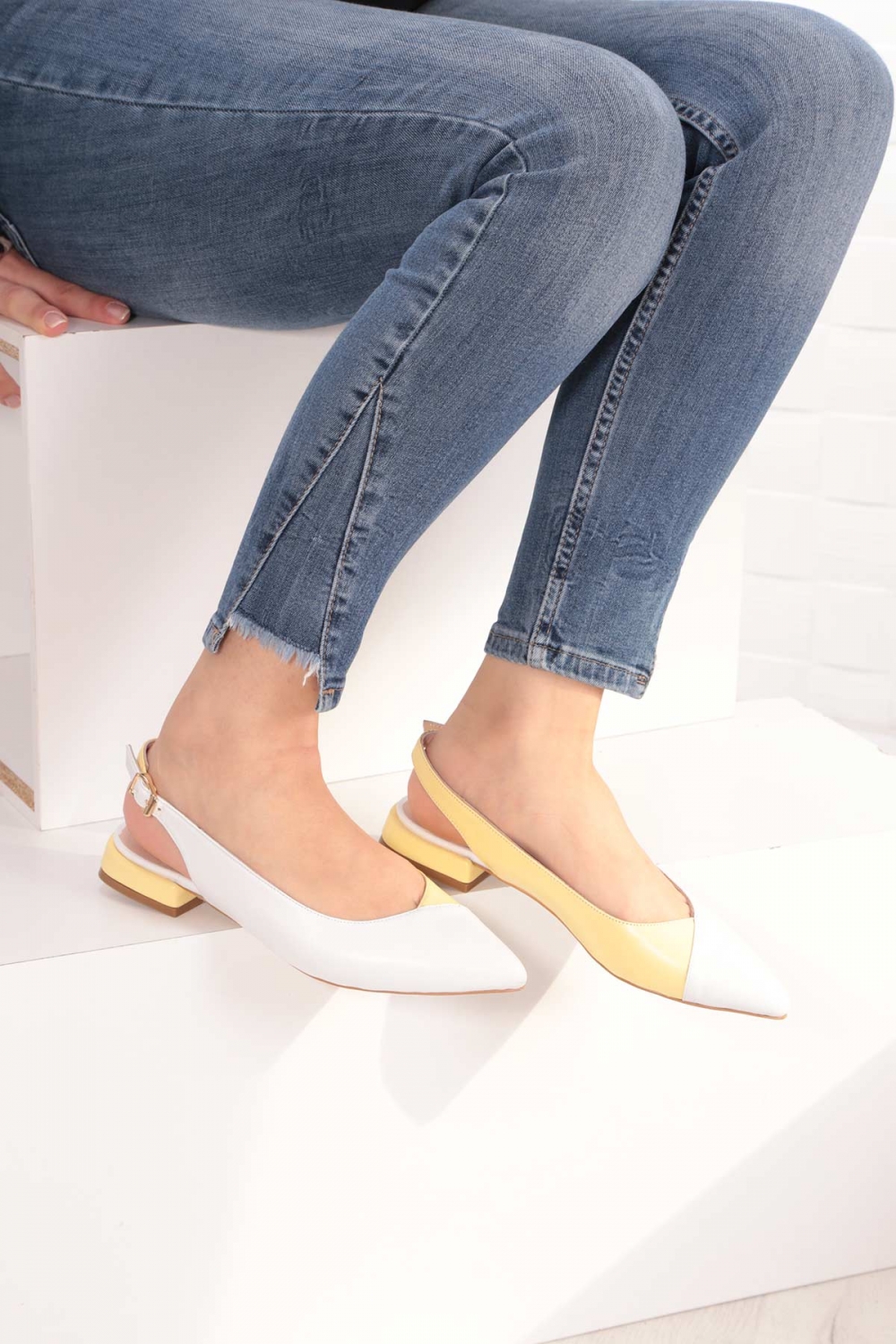 Hakiki Deri Beyaz-Limon Sarısı Kadın Burun Kapalı Sandalet 211127508