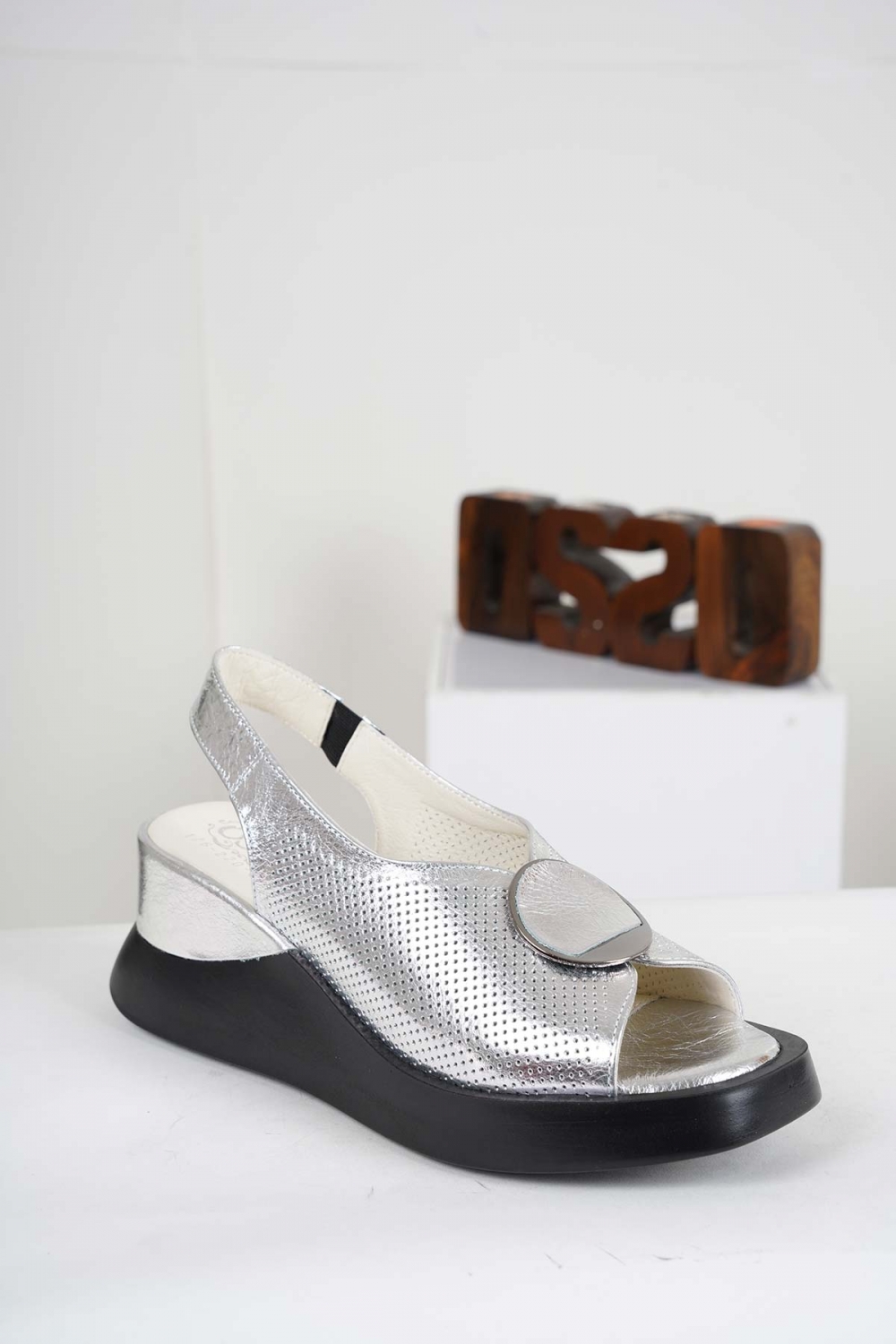 Hakiki Deri Gümüş Kadın Dolgu Topuk Sandalet 241176501