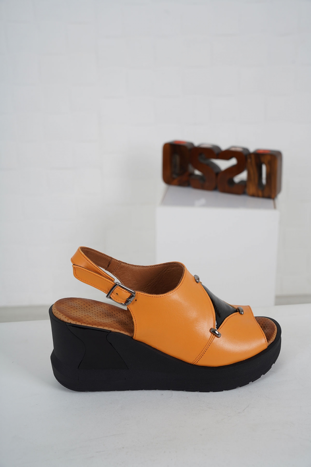 Hakiki Deri Kayısı-Siyah Rugan Kadın Dolgu Topuk Sandalet 231229504