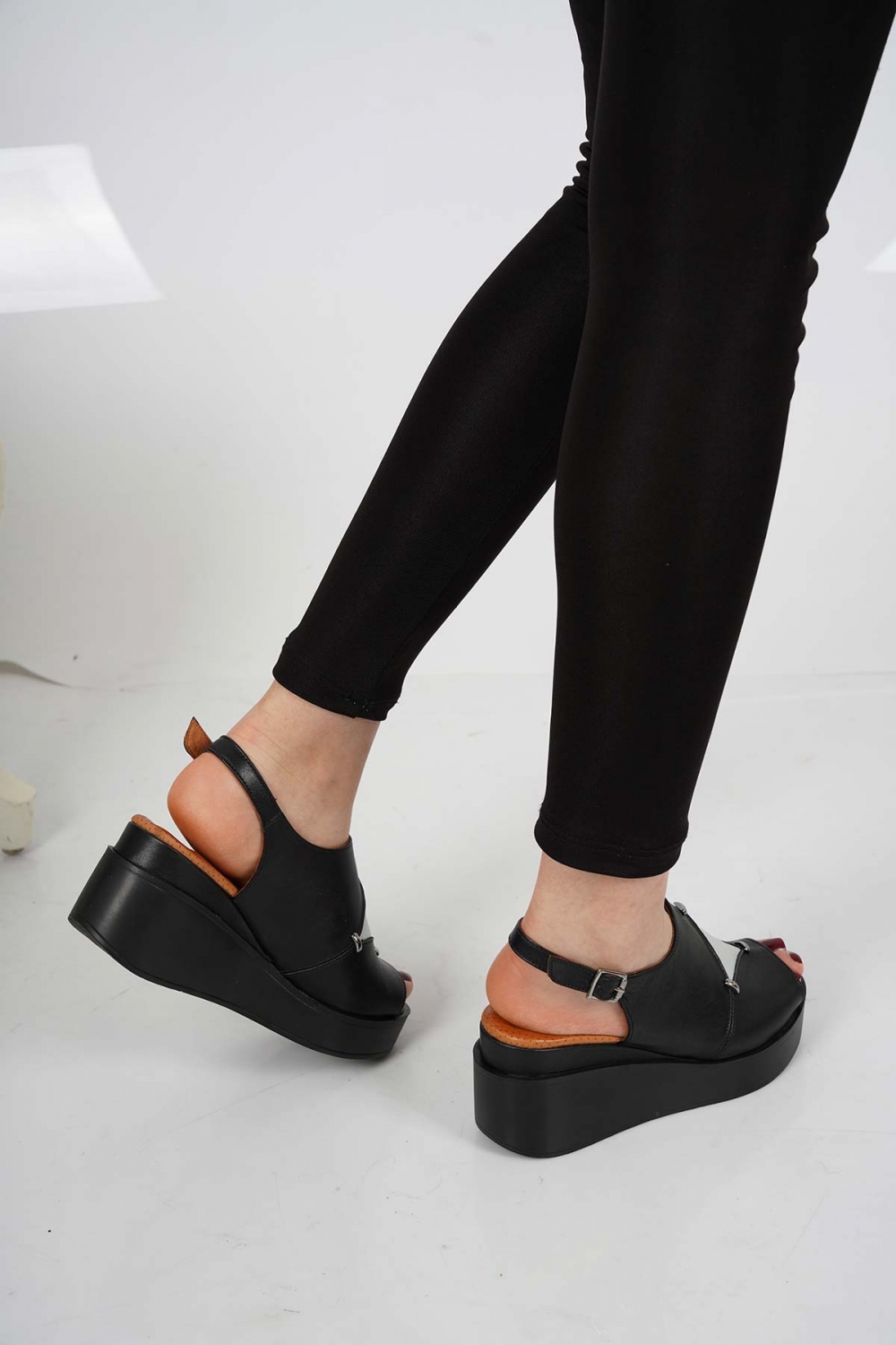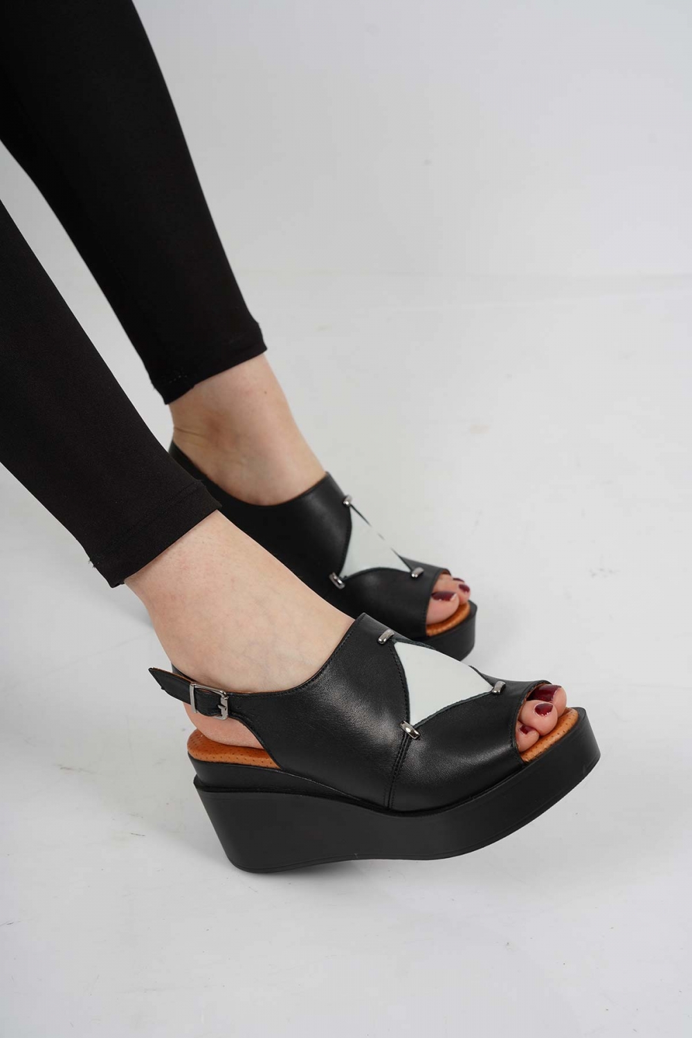 Hakiki Deri Siyah-Gri Kadın Dolgu Topuk Sandalet 231229509