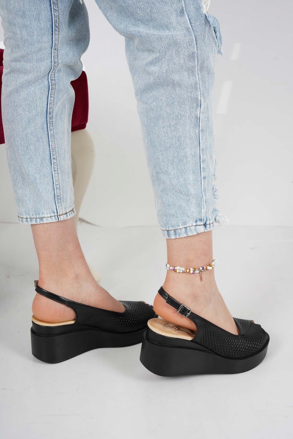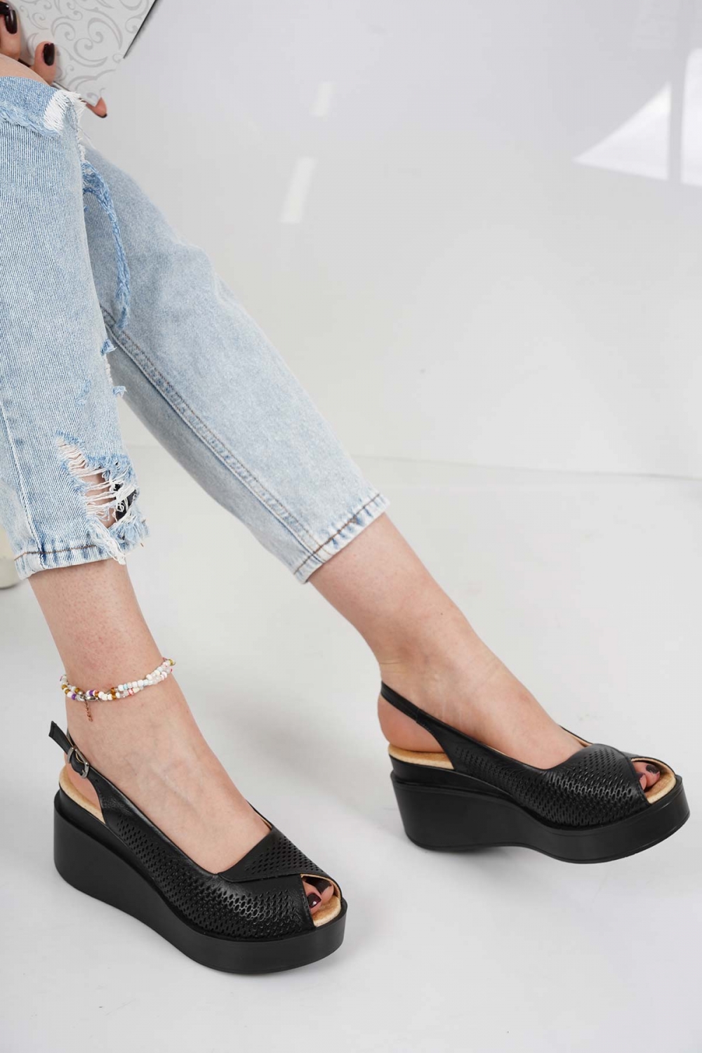 Hakiki Deri Siyah Kadın Dolgu Topuk Sandalet 231229510