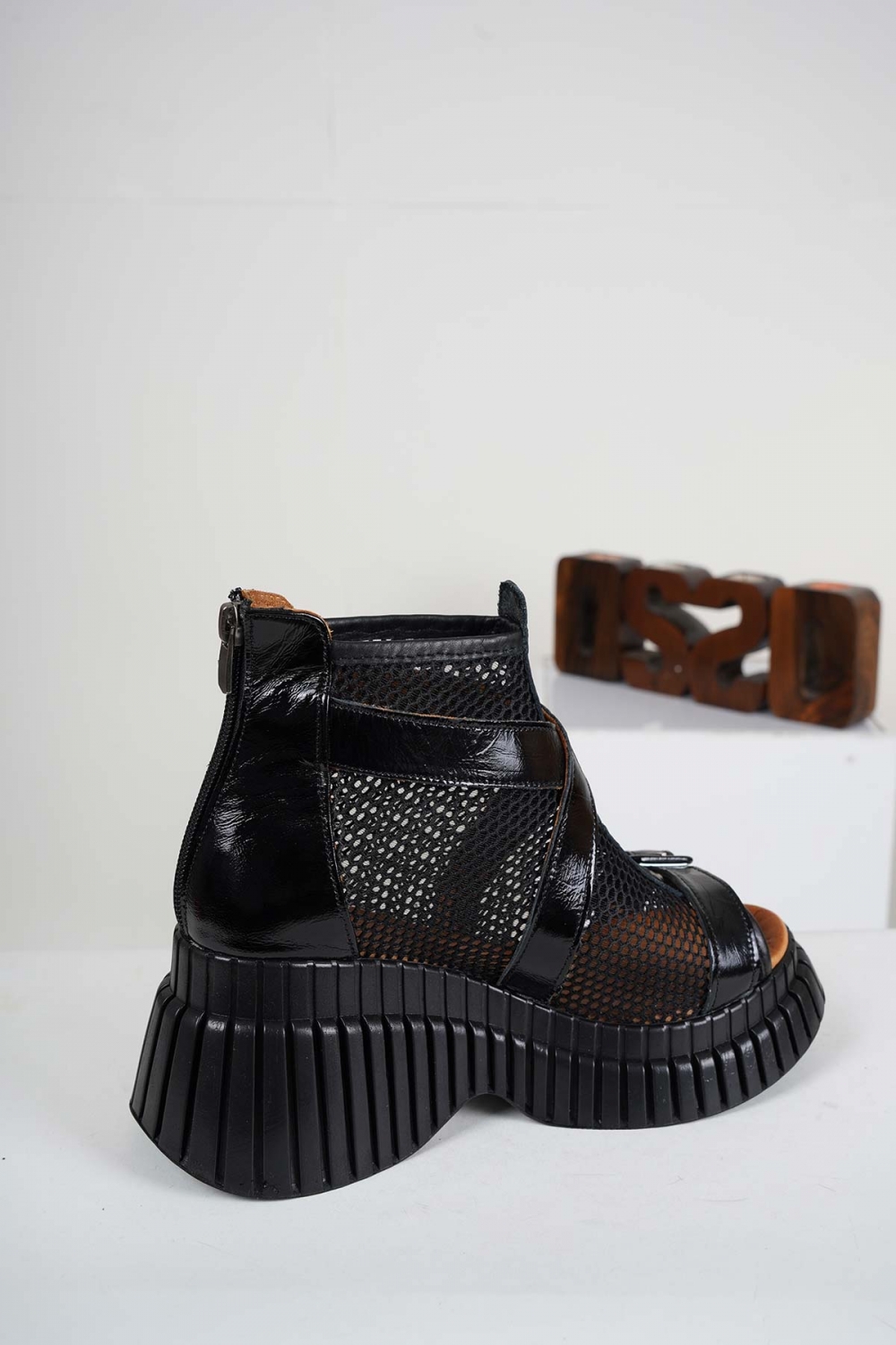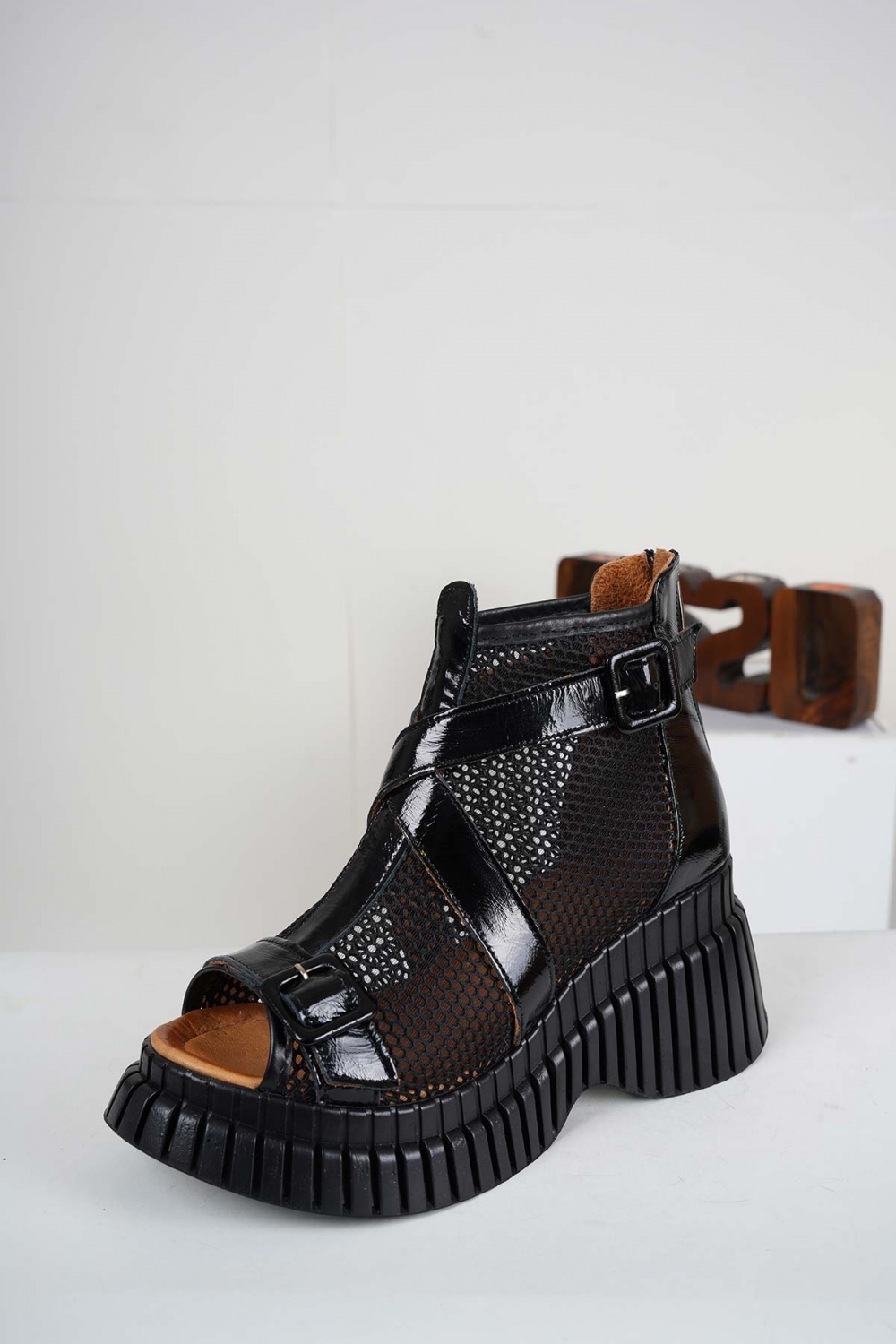 Hakiki Deri Siyah Rugan Kadın Dolgu Topuk Sandalet 241229516