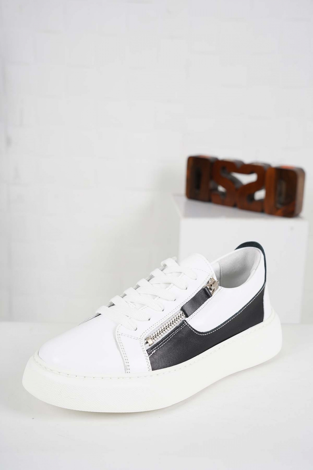 Hakiki Deri Beyaz-Siyah Kadın Sneaker Ayakkabı 241218102
