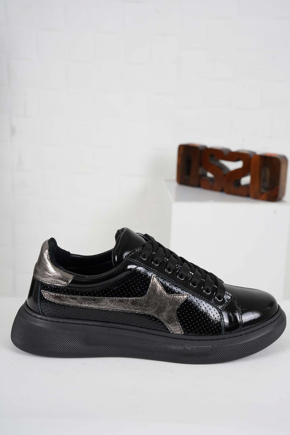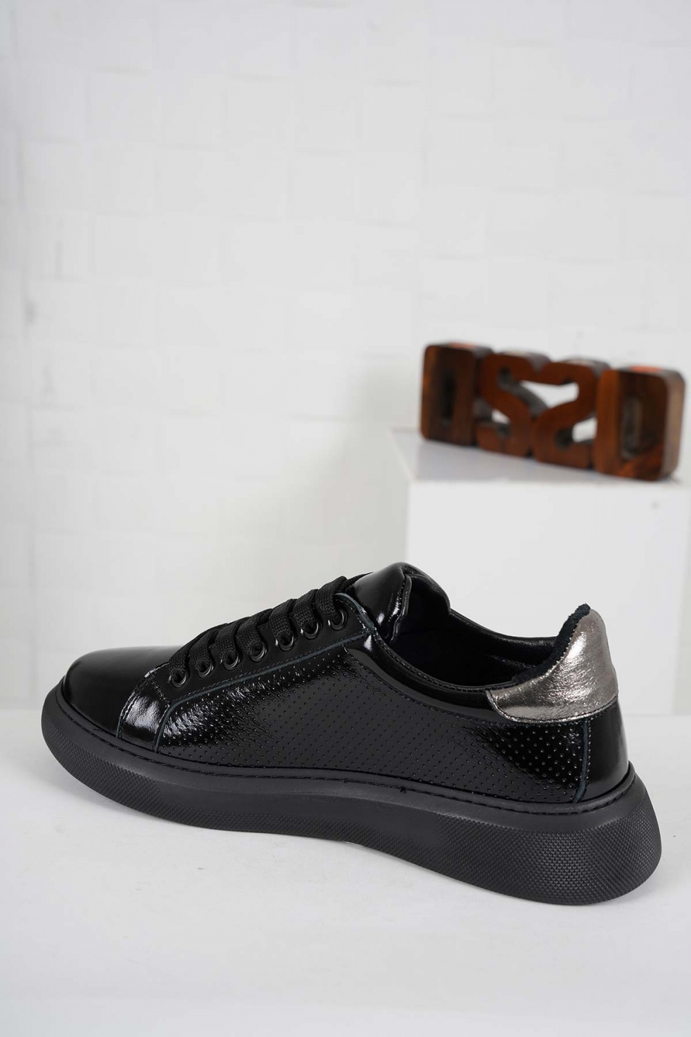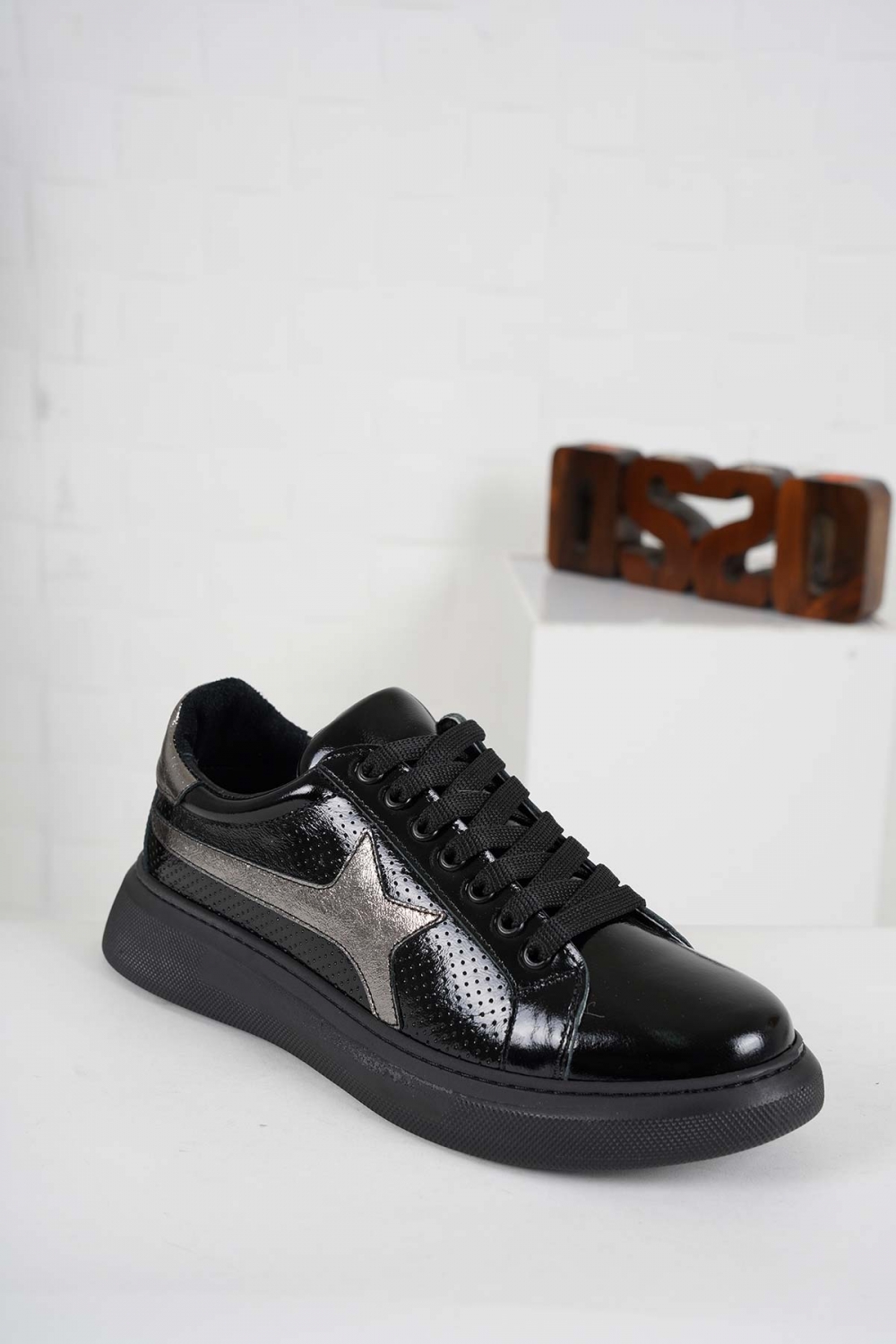 Hakiki Deri Siyah Rugan-Siyah Nikel Kadın Sneaker Ayakkabı 241218100